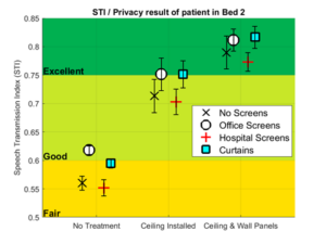 The privacy conditions of a patient in the middle bed (Bed #2) were assessed in reference to speech coming directly from the nurse’s desk as well as from the adjoining bedside. The STI was recorded assuming that a lower value would suggest better conditions for speech privacy.