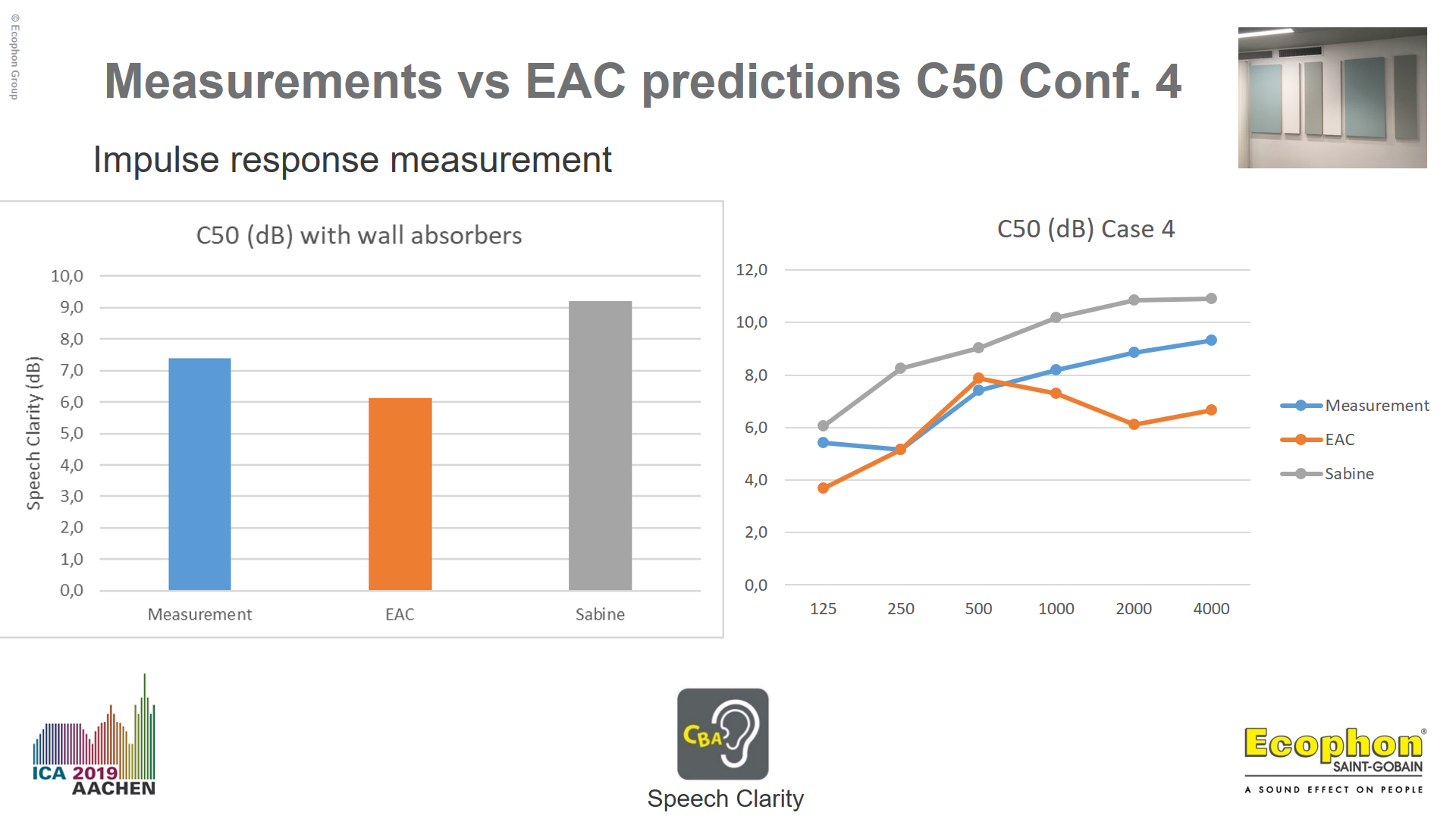 Then we made a comparison between the measurement results and our Ecophon acoustic calculator (assuming a non-diffuse room) and sabine calculations (assuming a diffuse room). The Ecophon Acoustic Calculator (EAC) is an SEA (statistical energy analysis) based calculator which takes into account the non-diffuse conditions.