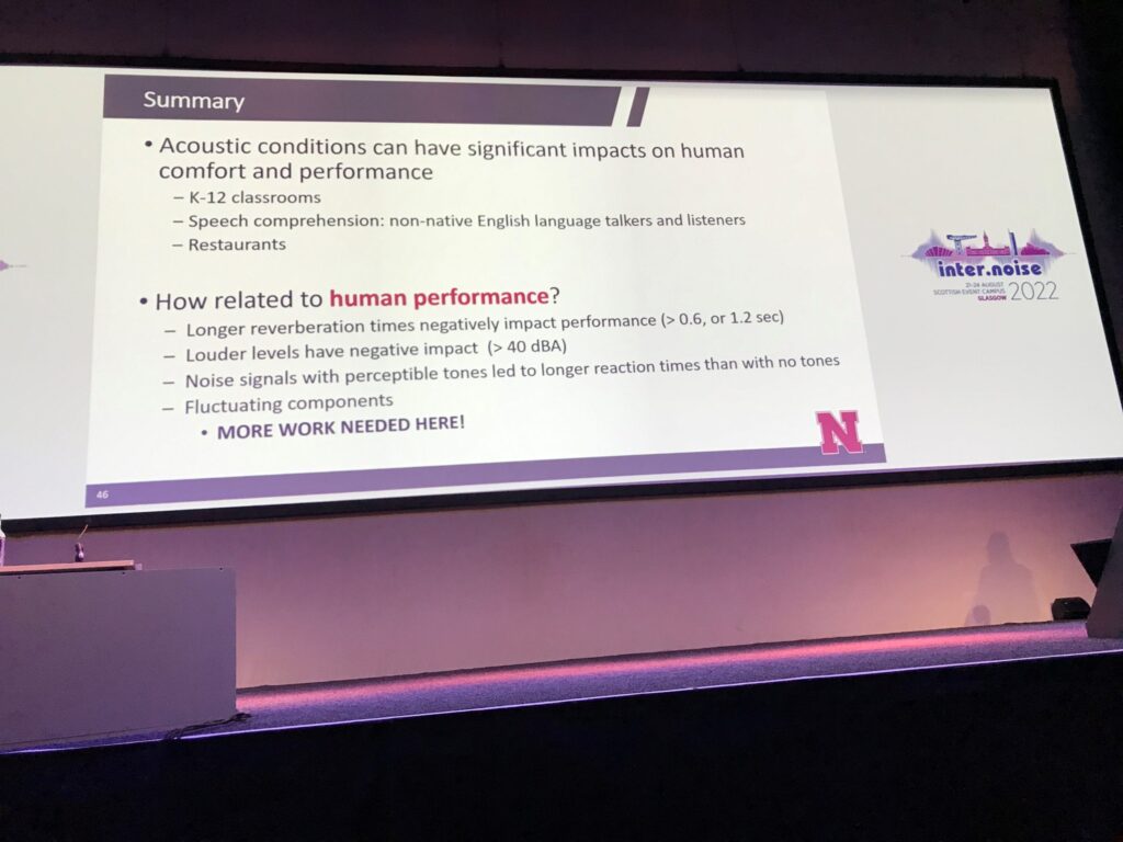 In her introduction, Lily also went through how standards and guidelines often recommend upper limits for Reverberation Time (RT) and Background Noise Levels (BNL) and as an example ANSI S12.60-2010 part 1 states that RT: 0.6-0.7 sec. (max) and BNL: 35 dBA (max). But Lily misses something in the standards and therefore her research goal is clear: She works for more evidence-based data to guide the acoustic design of built spaces – and she explores how indoor acoustic conditions relate to human comfort and performance. Also Lily strives to inform quantitative guidelines for what is permissible/optimal.