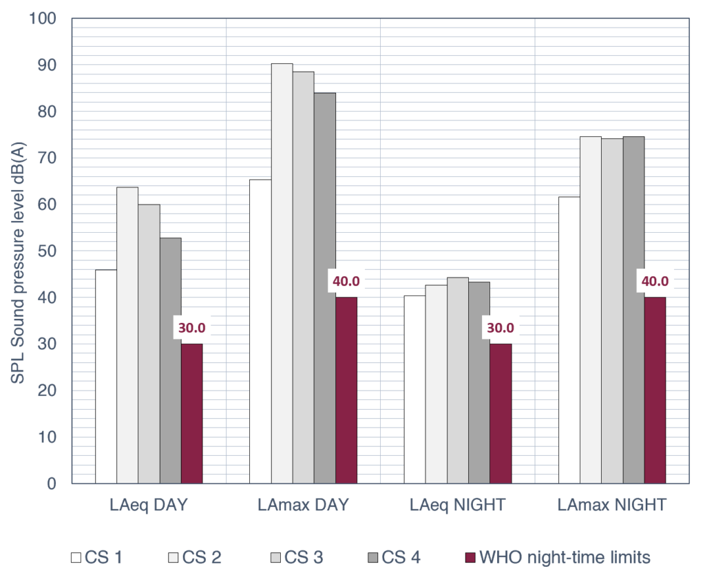 To understand the acoustic context of the ward, we conducted SPL and spectra monitoring and structured observations across four hospital wards. The results consistently showed sound levels that far exceeded the WHO recommendations (Figure 1).
