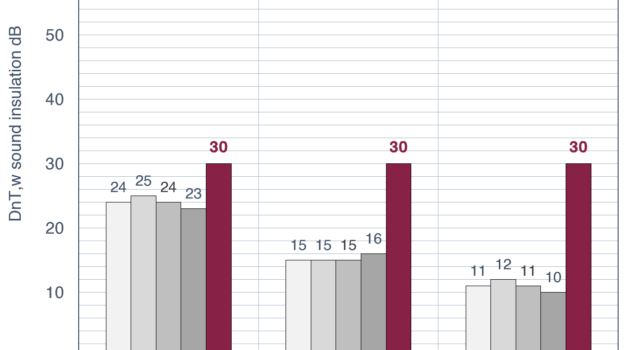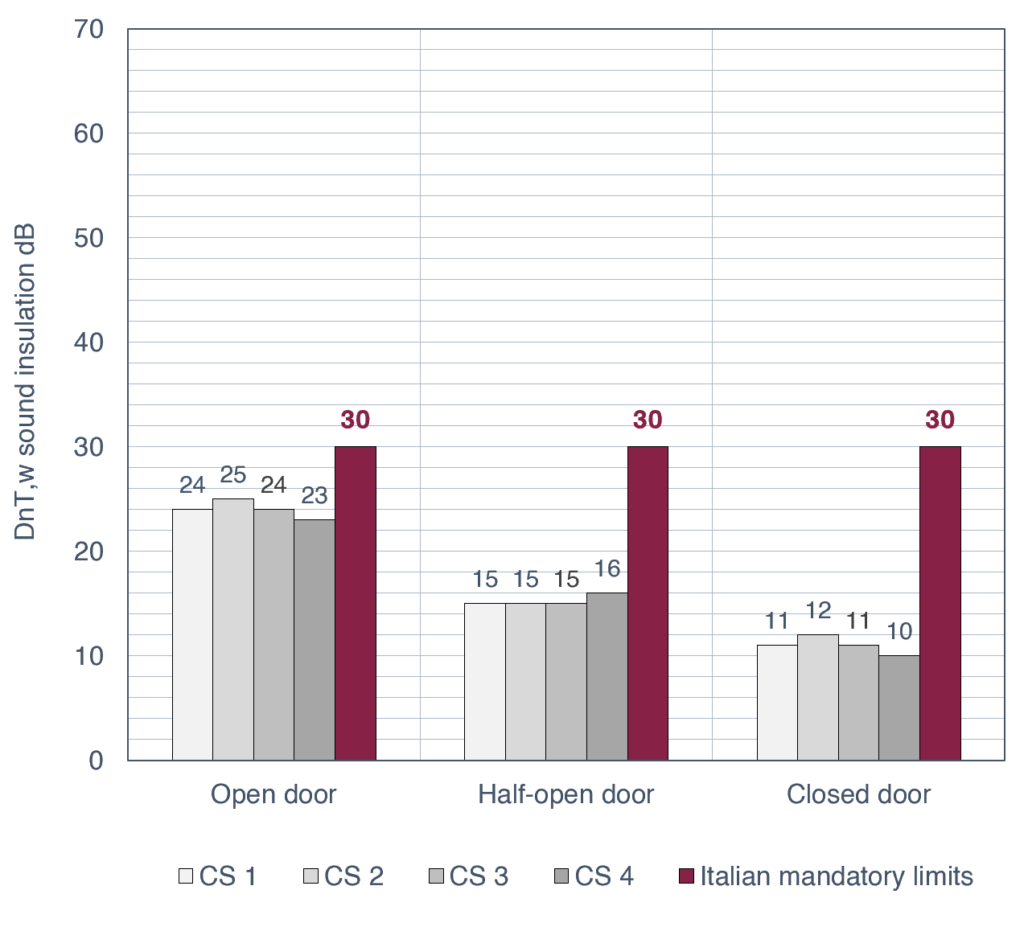 While Italian standards require DnT,w = 30 dB, a typical room in our study dropped from an average of 24 dB (closed) to 15 (half-open) to 11 dB when fully open (Figure 3).