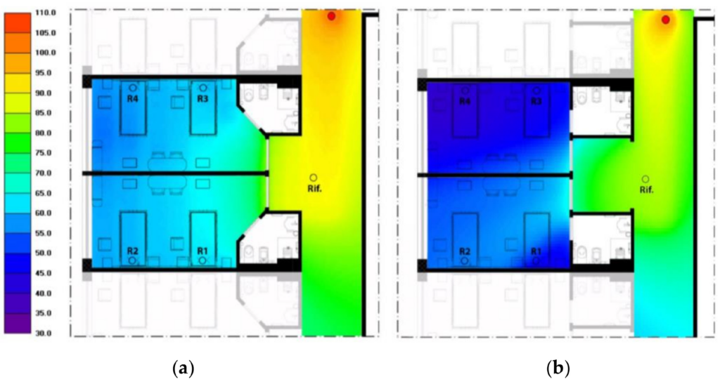 However, this 11 dB value represents the “residual” insulation provided primarily by the geometry of the room’s entrance and the materials of its surfaces, independent of the door’s performance. This finding suggests that probably the entrance zone—regardless of whether the door is kept open or closed—can be intentionally designed to act as an “acoustic filter”.