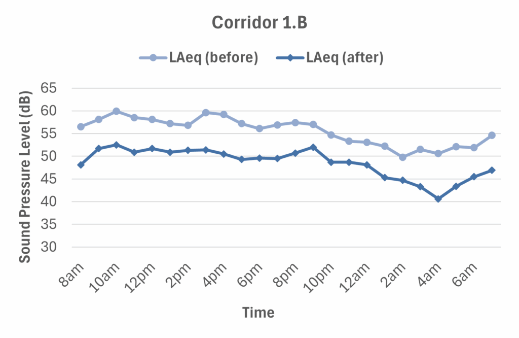 The interventions include the installation of Ecophon Meditec acoustically absorbent (absorption Class “A”) ceiling tiles and Ecophon Hygiene Carewall acoustically absorbent (absorption Class “A”) wall panels.