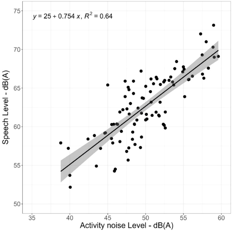 The above scatter plot shows the relationship between activity noise and speech levels [dB(A)] measured in classrooms. Each point represents an activity for a specific class. The solid line indicates the fitted linear regression, and the shaded area denotes the 95 % confidence interval.