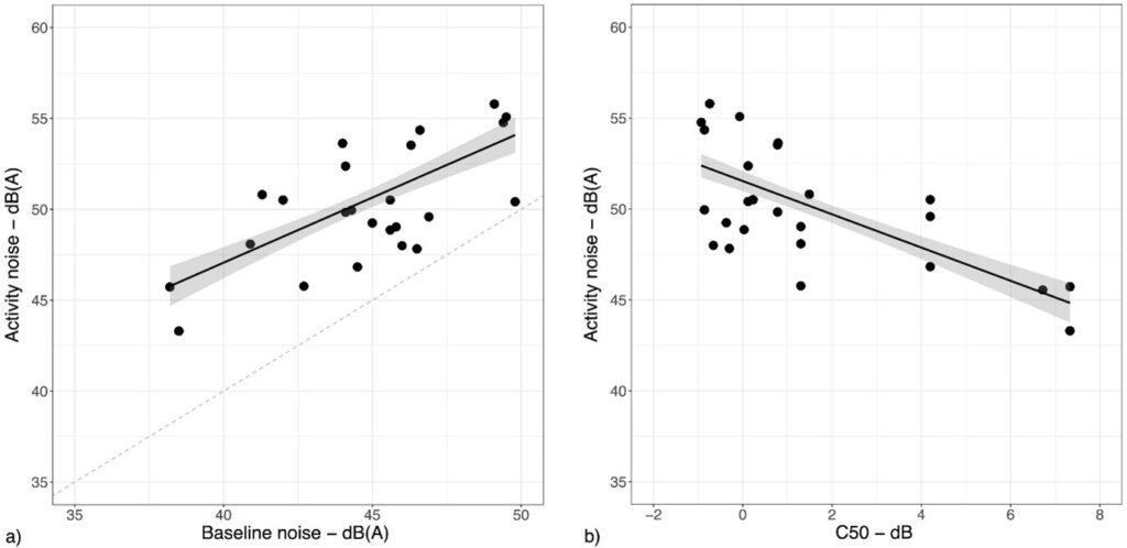 The above scatter plots illustrate the relationships between activity noise levels and (a) baseline noise, (b) speech clarity C50. Each point represents the mean value of the activity noise levels monitored in a class during different activities.